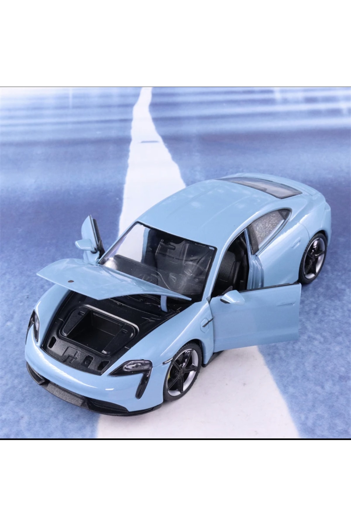Urun ithaldir. Porsche Taycan turbo s model ile birebir aynidir. 1/24 boyutundadir. Porsche maket arabadir. Bebe mavisi rengindedir. Kapilari on kaput vs acilmaktadir.